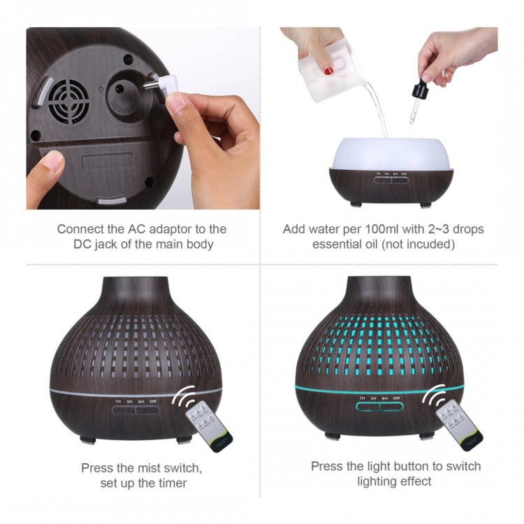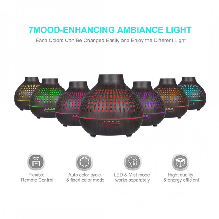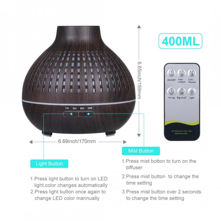 Umidificatorul are un design modern, cu aspect de lemn (2 nuante), culori diferite de lumina LED, este foarte silentios si iti poate crea mediul perfect pentru relaxare sau odihna. Este companionul ce te poate scapa de stres, durerile de cap si contribui la incarcarea ta de energie. Nivelul de zgomot este unul foarte scazut contribuind la sesiunile de meditatie sau la un somn dulce, odihnitor.