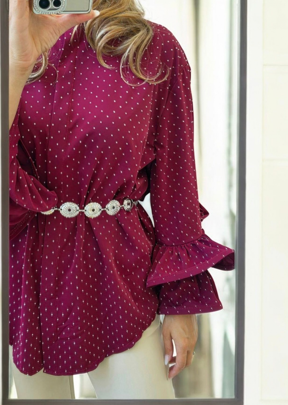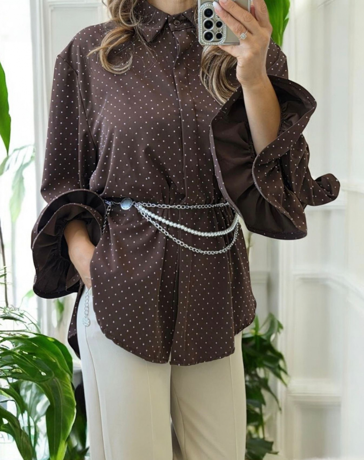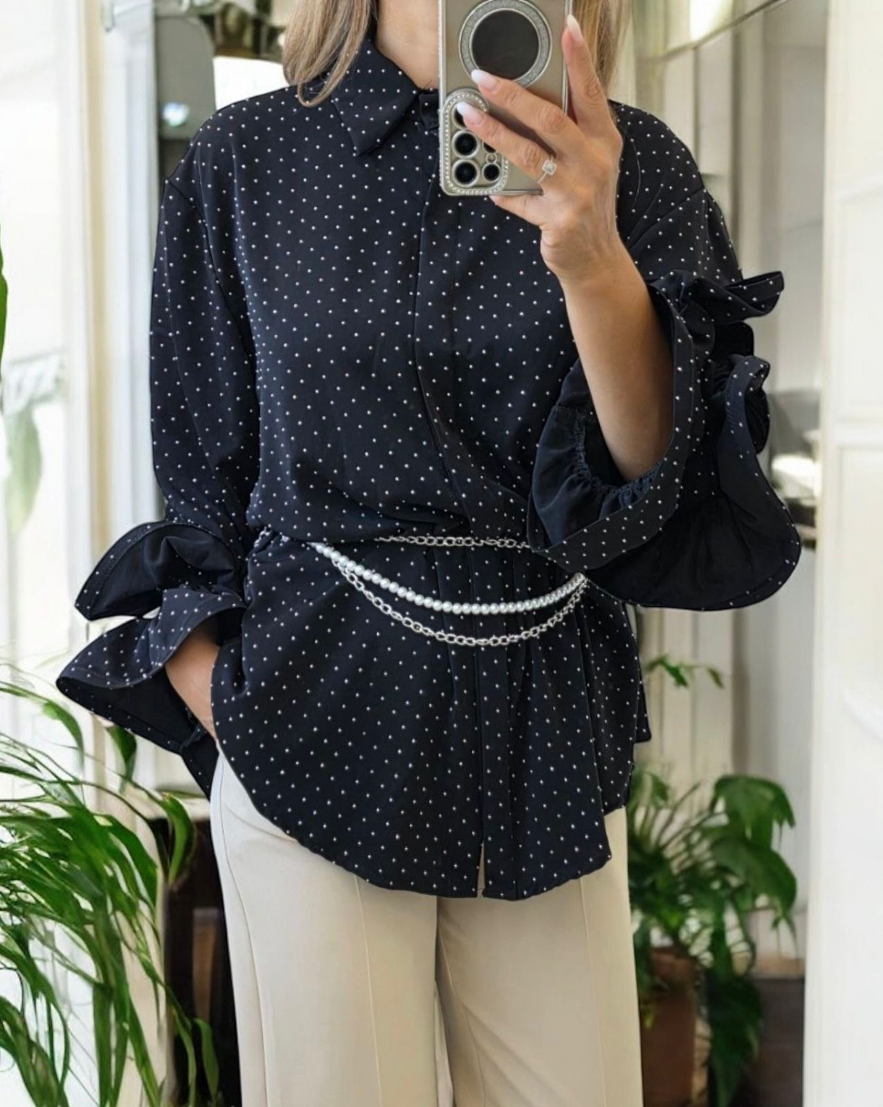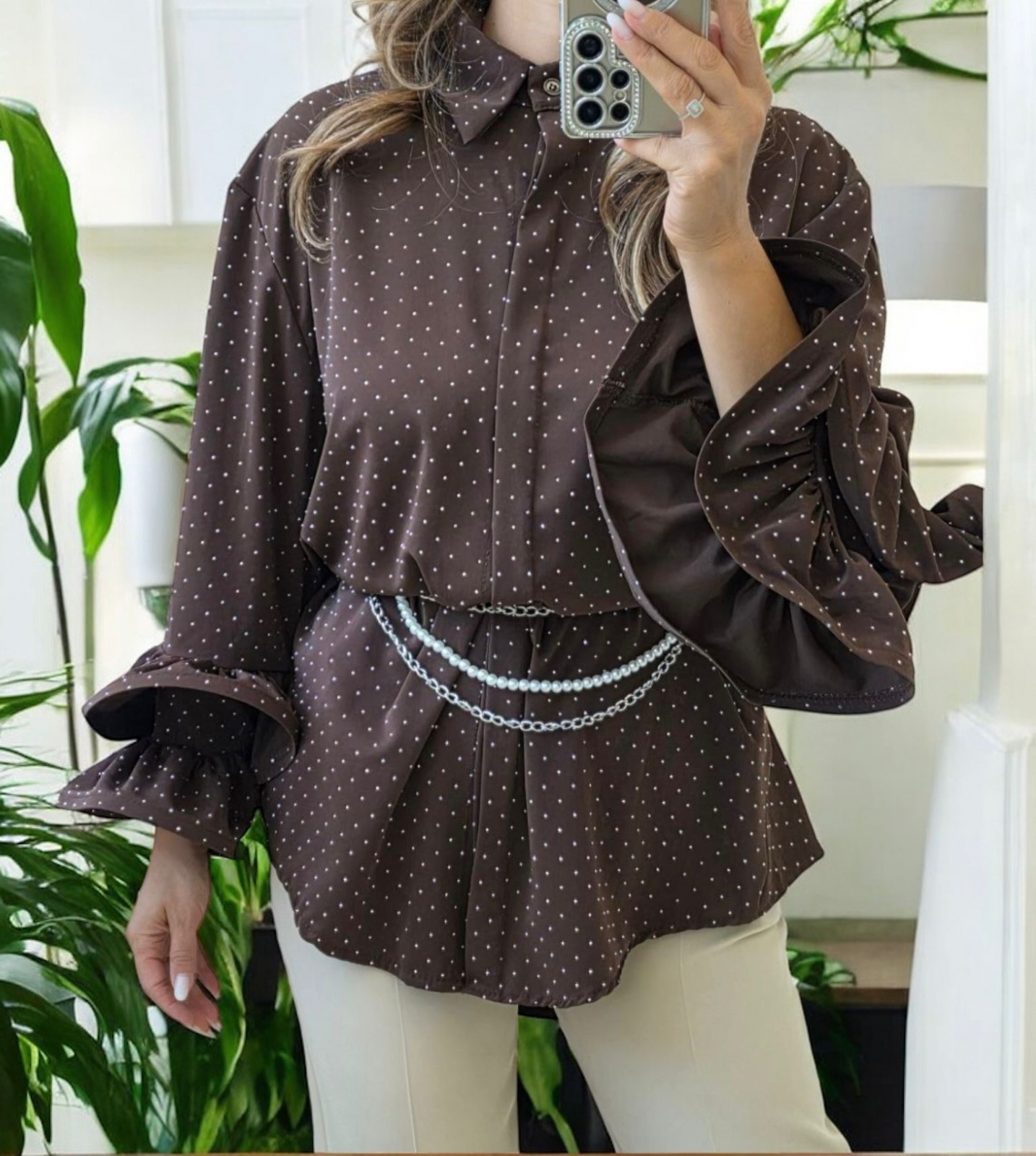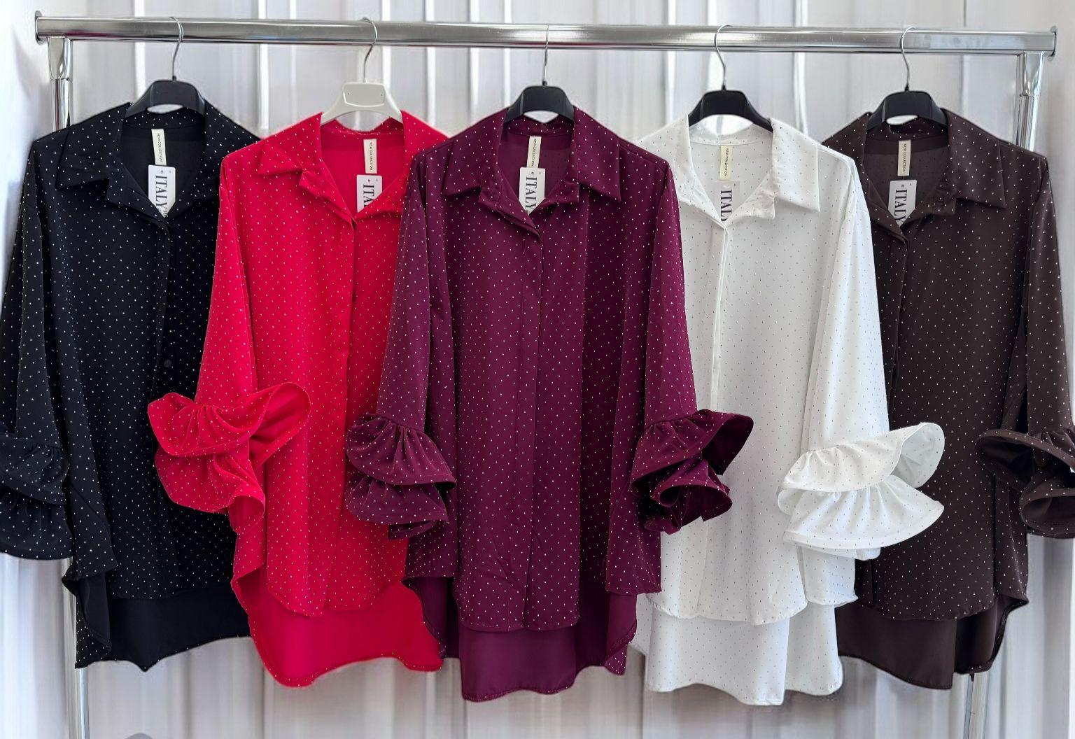 Bluza este disponibila in mai multe culori elegante: alb, negru, bordo, maro si rosu, fiind usor de integrat atat in tinute casual, cat si in tinute office sau de eveniment. Pietricelele delicate confera un efect subtil de stralucire, adaugand o nota feminina si rafinata.