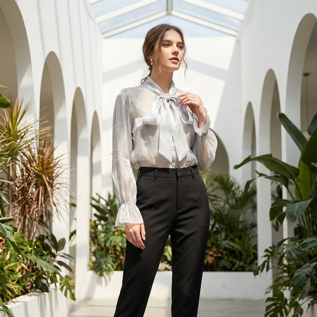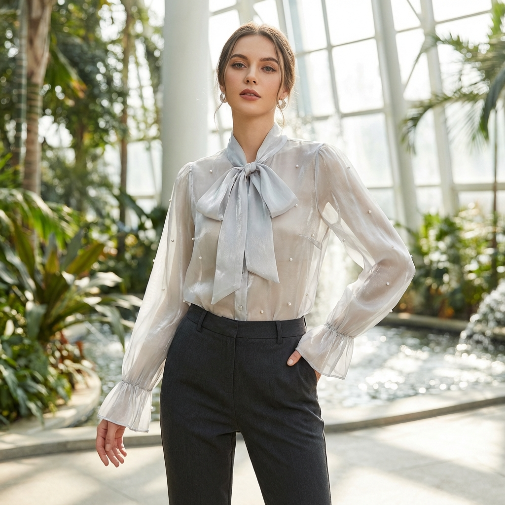 Camasa dama organza cu perle si funda la guler