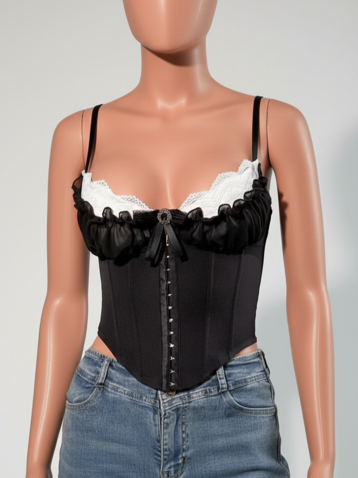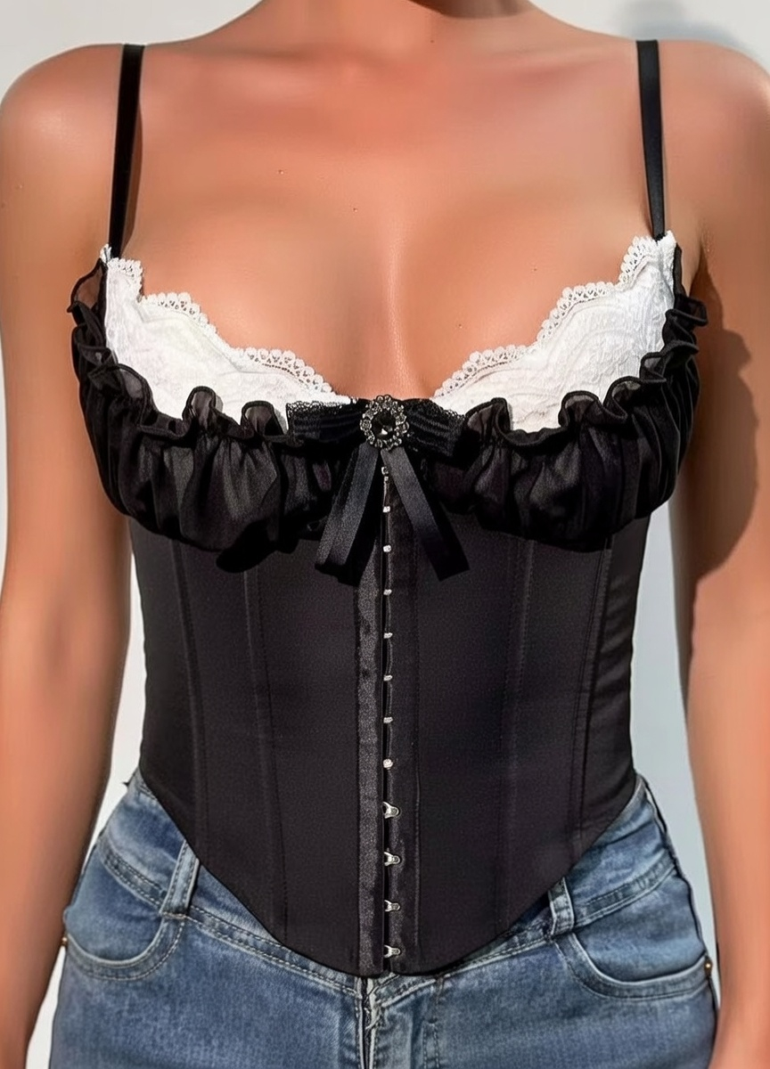 Adauga o piesa de rezistenta colectiei tale cu acest corset negru sofisticat, creat pentru a pune in valoare feminitatea si a sculpta silueta. Designul sau unic imbina stilul clasic al corsetului cu elemente moderne si romantice, fiind ideal pentru tinutele de party, festival sau iesiri in oras unde vrei sa iesi in evidenta.