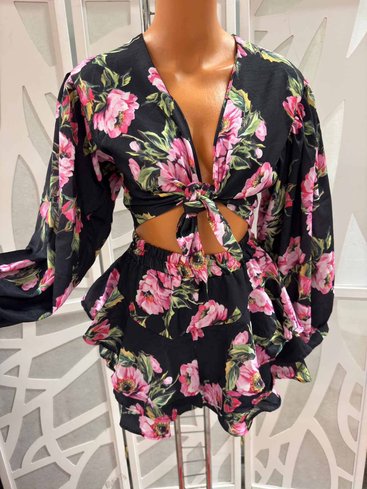 Set dama cu top cropped si fusta-pantalon, cu maneci bufante si imprimeuri trendy, ideal pentru vara. Marime universala (S-M).