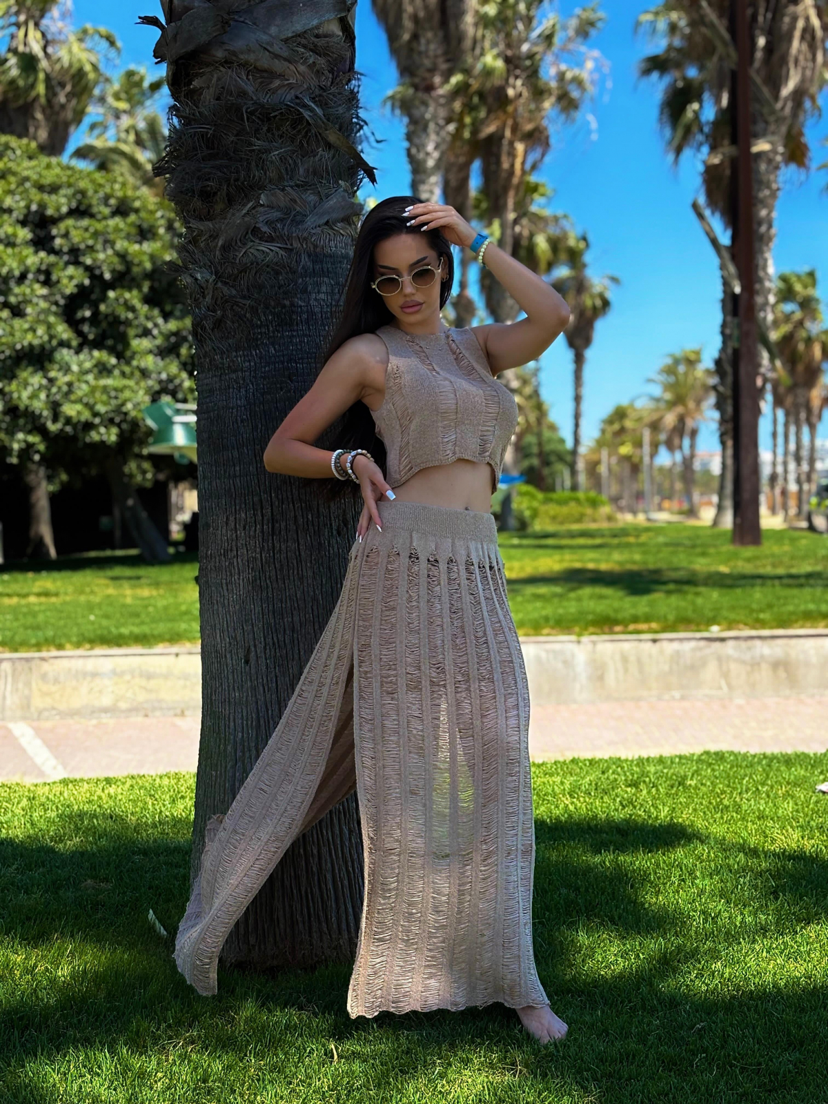 Transforma-ti aparitia la plaja intr-o declaratie de stil cu acest set tricotat compus din doua piese: un top crop fara maneci si o fusta lunga cu slit lateral generos. Realizat dintr-un material vaporos, cu textura crosetata, acest set este perfect pentru zilele toride de vara, festivaluri sau vacante exotice.