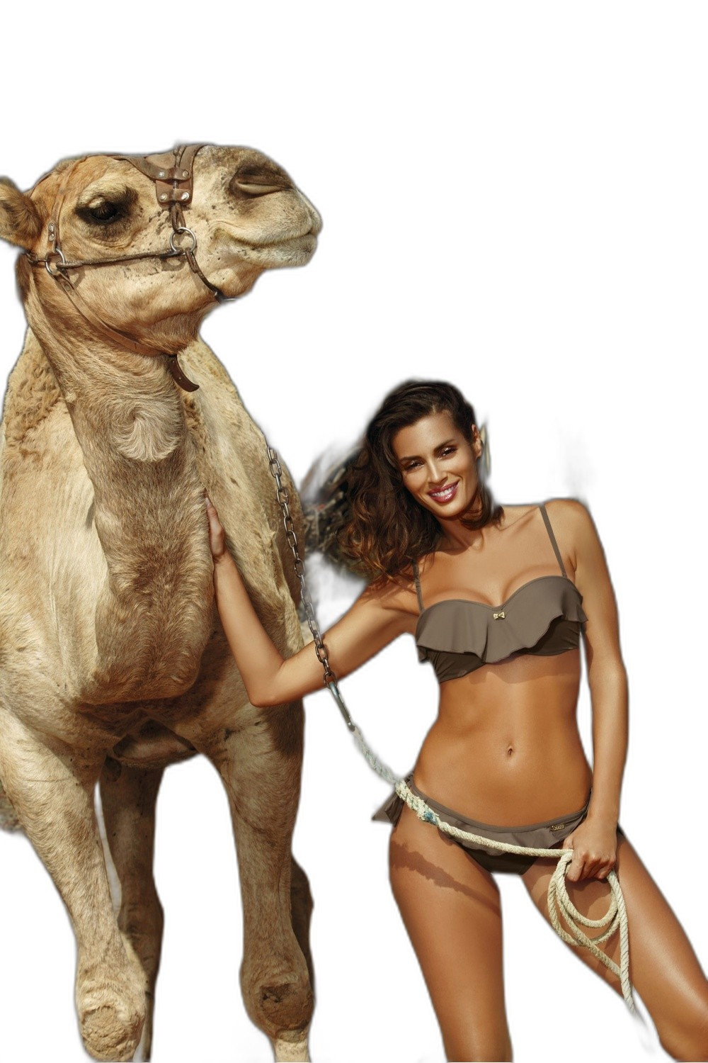 Frumos costum de baie din doua piese, decorat cu volane aerisite, la moda in acest sezon. Cu o funda aurie in centrul decolteului. Partea de jos cu croiala braziliana. Daca visezi la sani mari, fermi si sexy, frumos stransi la decolteu - aceasta propunere este doar pentru tine. Costumul de baie are un aspect dulce si inocent, este disponibil in multe culori atractive si fiecare intr-o tesatura grozava, moale si elastica. Sutienul se distinge printr-o constructie minunata destinata sanilor mici si mijlocii - este captusit si are o umplutura push up destul de mare, plasata permanent in sutien. Curele reglabile si detasabile, ideale pentru bronzarea corpului. Circuit fixat cu o catarama. Chilotii sunt sexy, legati la partile laterale bratari cu un volan in partea de sus. Pentru un efect complet, fundul trebuie tras strans pana in partea superioara a soldurilor, astfel incat forma sa triunghiulara sa decoreze frumos fundul, care se extinde partial dincolo de conturul fundului.