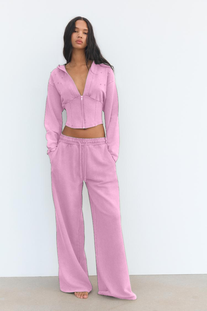 Compleu dama 2 piese din bumbac organic, set trening casual cu bluza cu gluga si pantaloni cu talie inalta