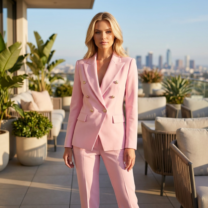 Ridica standardele garderobei tale cu acest compleu sofisticat din doua piese, creat special pentru femeia care doreste sa imbine profesionalismul cu un stil modern si luxos. Designul se remarca prin atentia la detalii, in special prin nasturii metalici aurii care adauga un contrast pretios si o nota de rafinament tinutei.