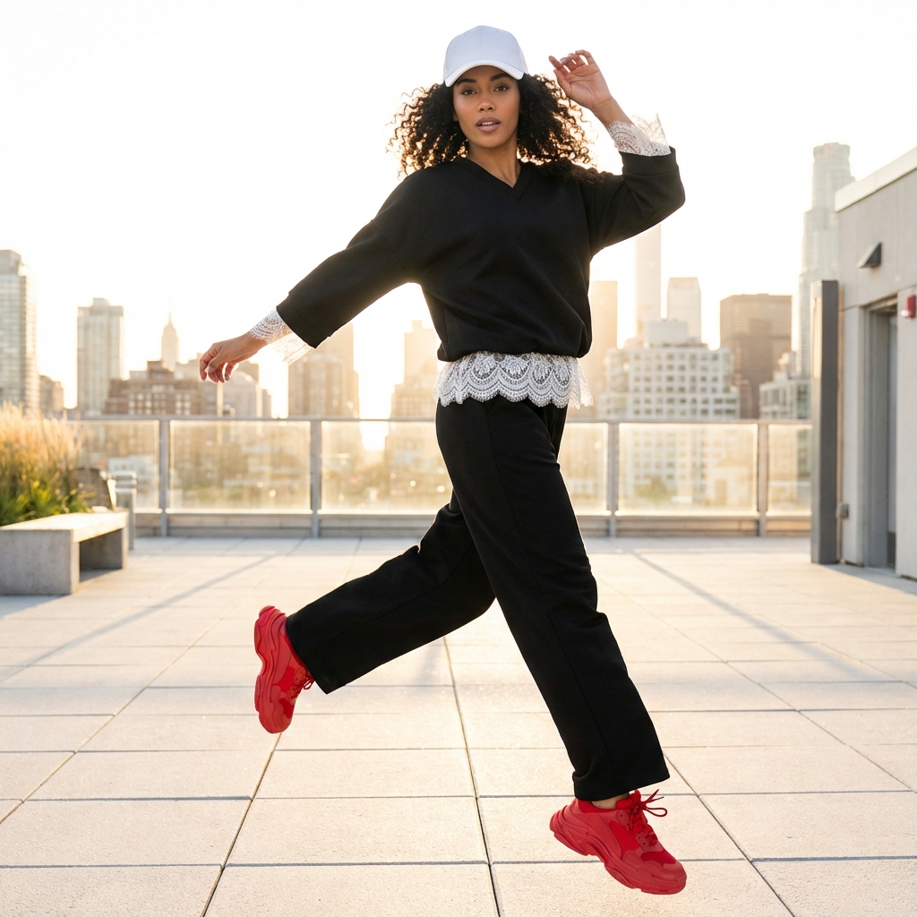 Pantaloni cu Talie Elastica: Pantalonii dispun de o banda elastica confortabila in talie, adaptandu-se perfect pe orice silueta si asigurand sustinere fara a strange.
