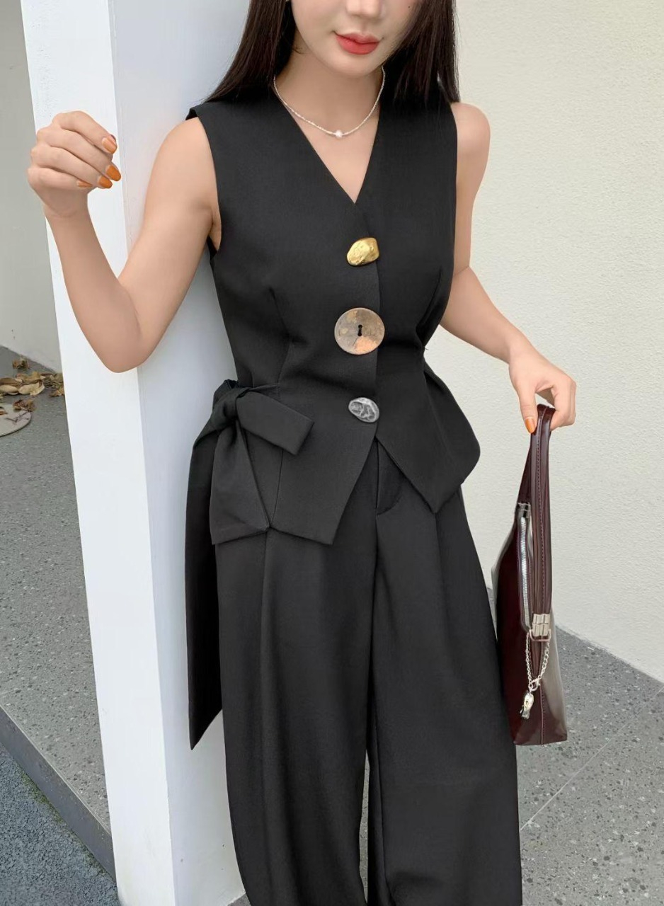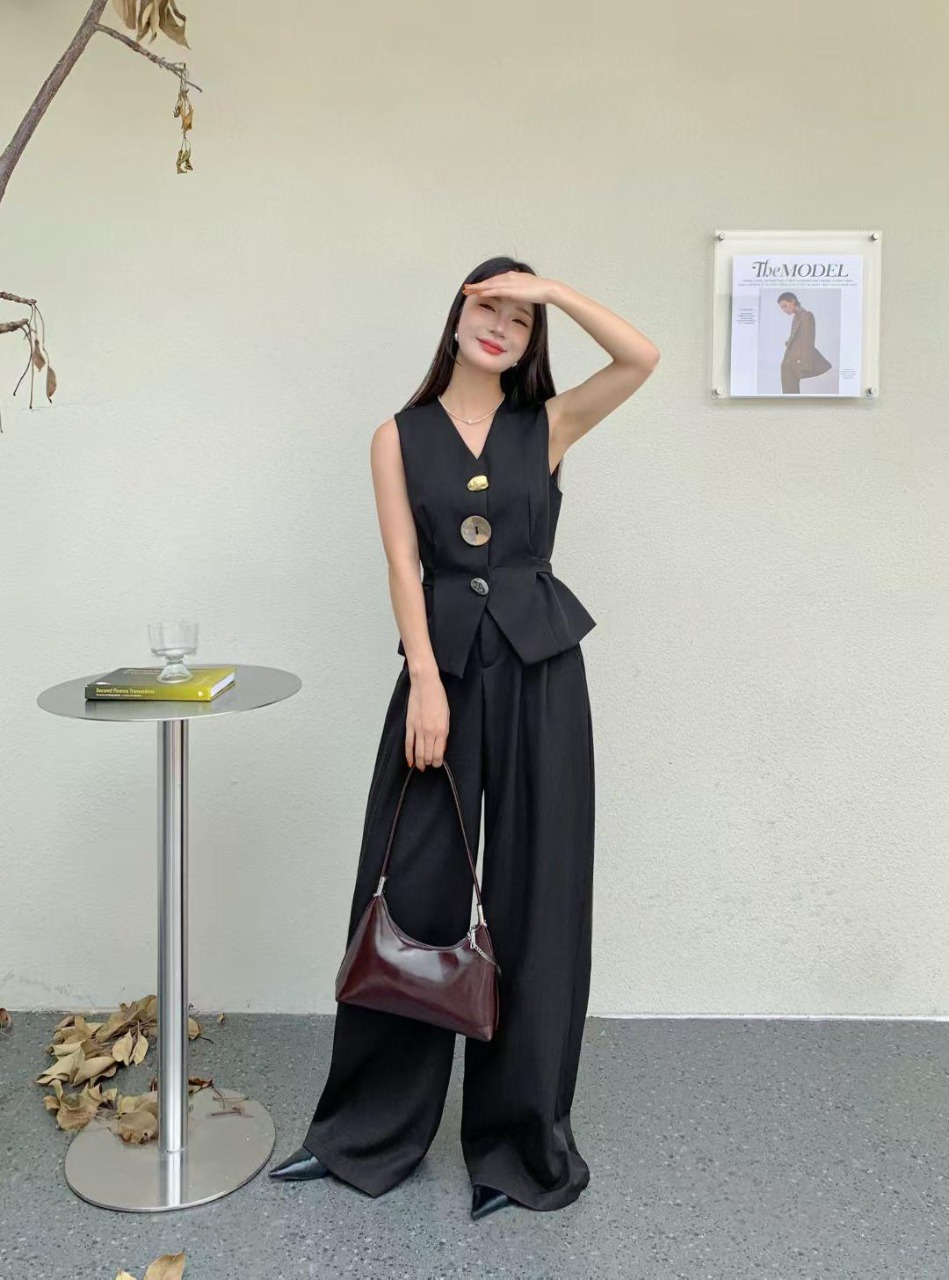 lege rafinamentul si versatilitatea cu acest compleu in doua piese din stofa de vascoza de calitate superioara. Setul este format din vesta eleganta, cambrata, cu nasturi decorativi supradimensionati si pantaloni cu croi larg, foarte comozi si moderni. Croiala este gandita sa avantajeze orice silueta, iar materialul ofera lejeritate si un aspect premium.