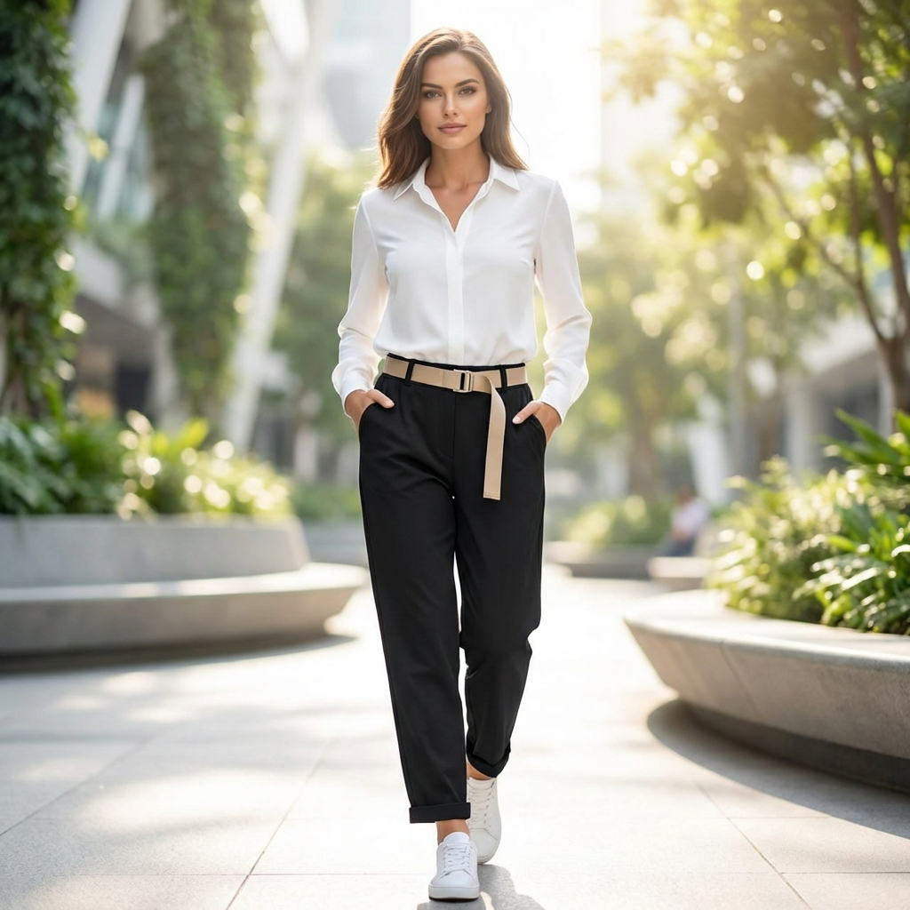 Professional Office Look: Combina pantalonii intr-o nuanta neutra (bej sau negru) cu o camasa alba din bumbac si pantofi stiletto. Cureaua inclusa va completa perfect aceasta tinuta sobra si eleganta.