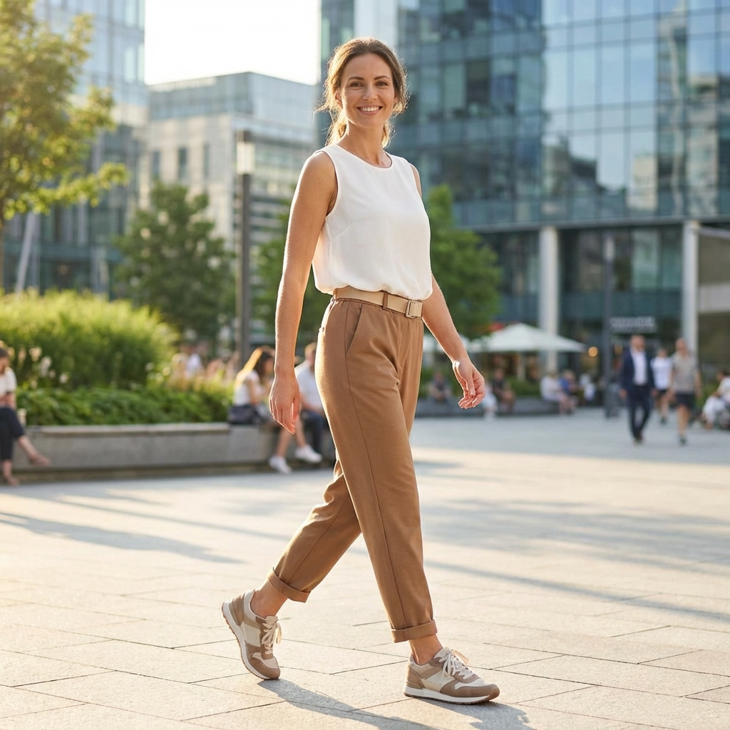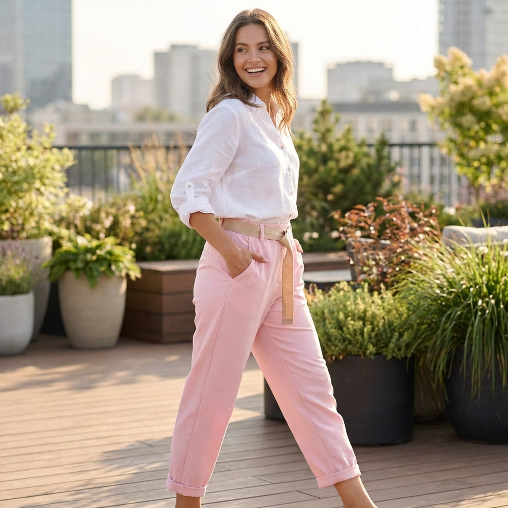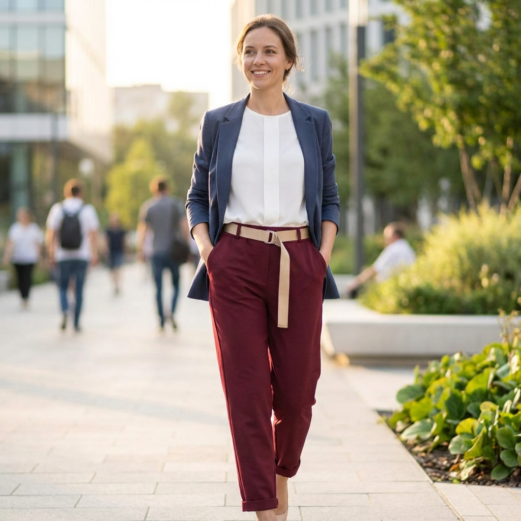 Smart Casual Vibes: Alege o culoare indrazneata si poarta-i cu un tricou simplu alb si tenisi minimalisti. Ruleaza usor tivul pentru un look relaxat de weekend.