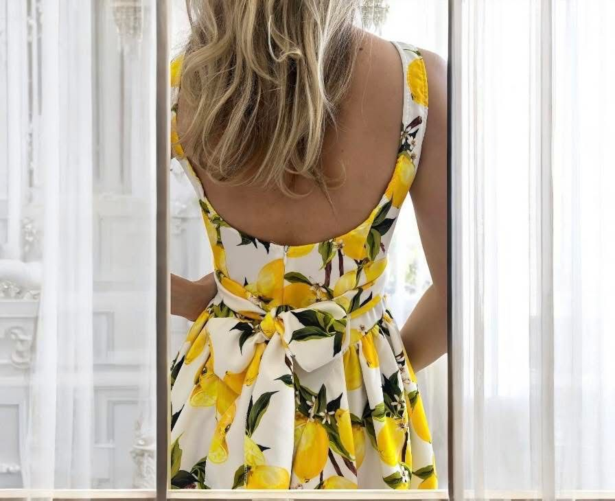 Rochie mini cu imprimeuri fresh – lămâi, porțelan sau leopard. Croială feminină, fundă la spate. Potrivită mărimilor S-M.