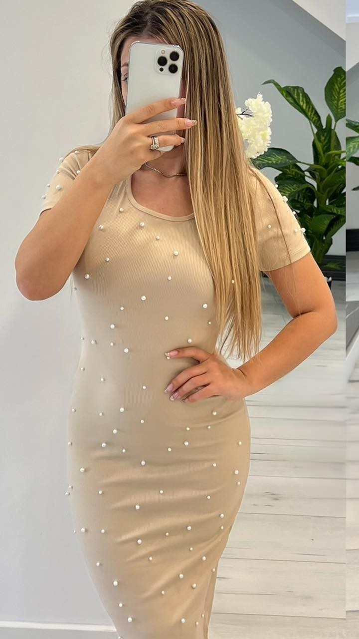 Descopera rafinamentul si feminitatea cu aceasta rochie mulata decorata cu perle, perfecta pentru evenimente, iesiri in oras sau ocazii speciale. Fabricata dintr-un material elastic de calitate, urmeaza linia corpului si evidentiaza silueta. Designul minimalist este completat de aplicatiile discrete din perle, iar croiul midi si maneca scurta adauga un aer elegant, dar confortabil.