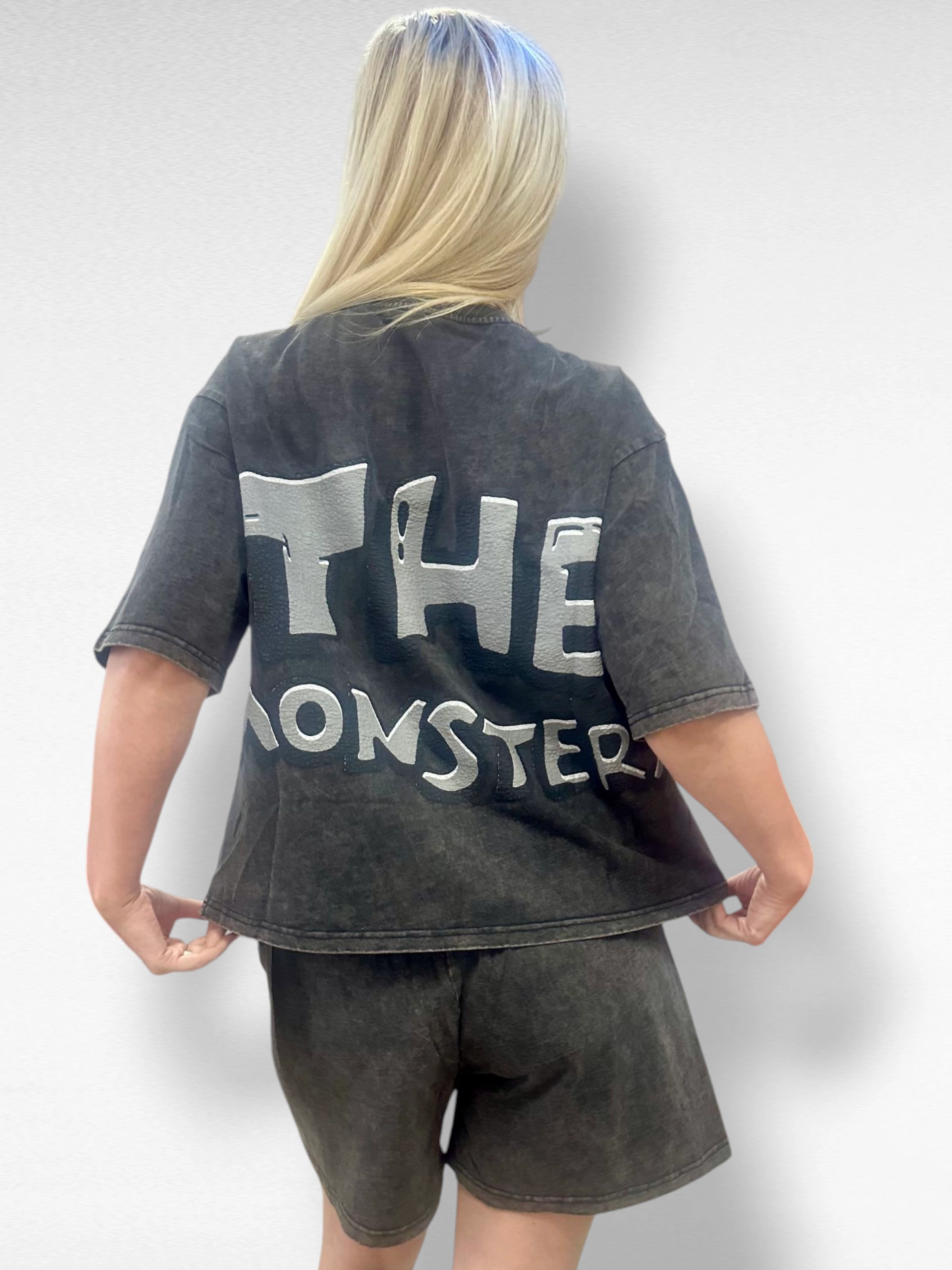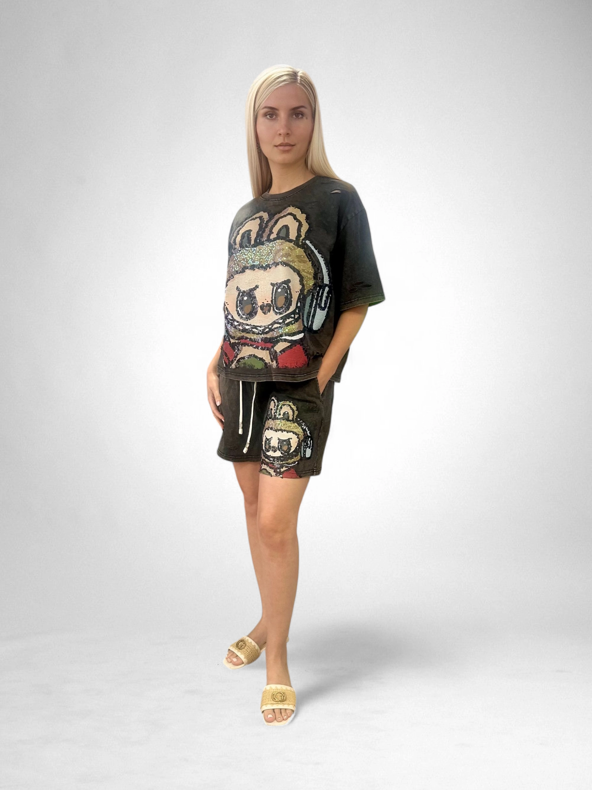 Setul casual premium este realizat din bumbac de calitate superioara, provenit din Coreea, cu finisaje atent lucrate si aplicatii cu paiete si imprimeuri moderne inspirate de cultura urbana.