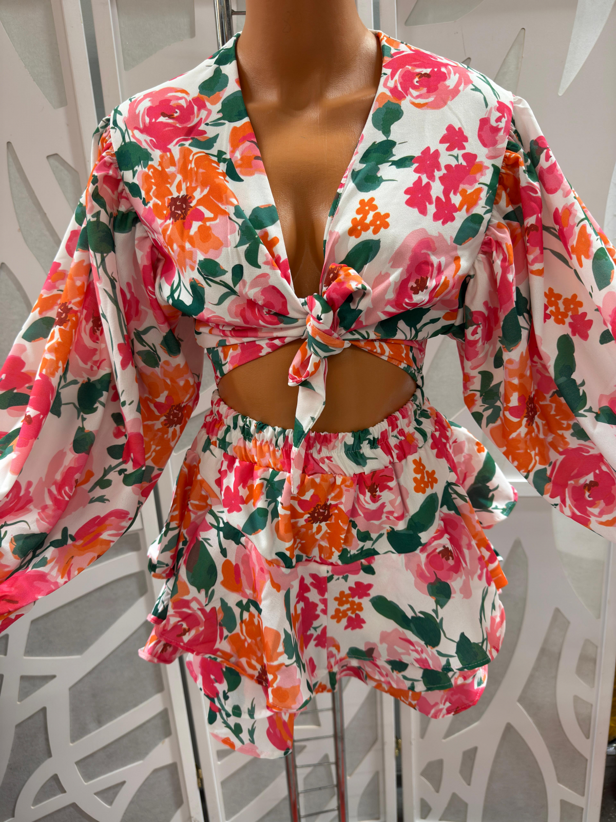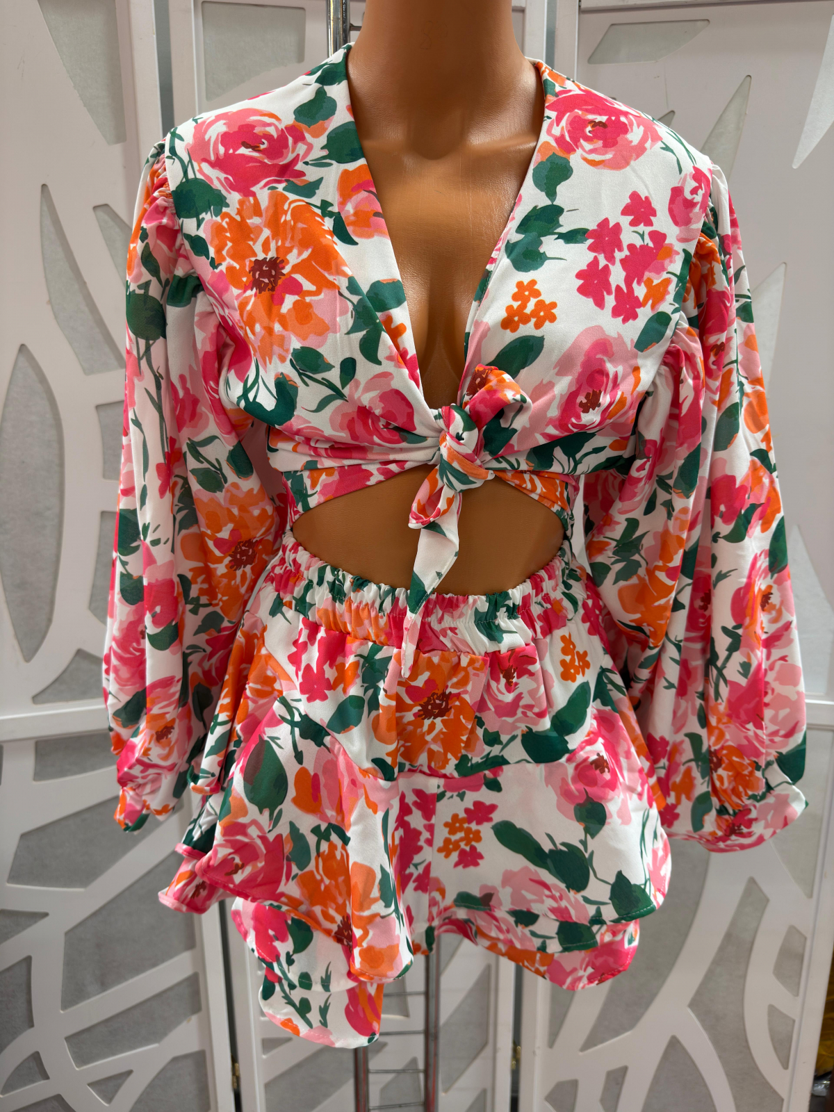 Set dama cu top cropped si fusta-pantalon, cu maneci bufante si imprimeuri trendy, ideal pentru vara. Marime universala (S-M).