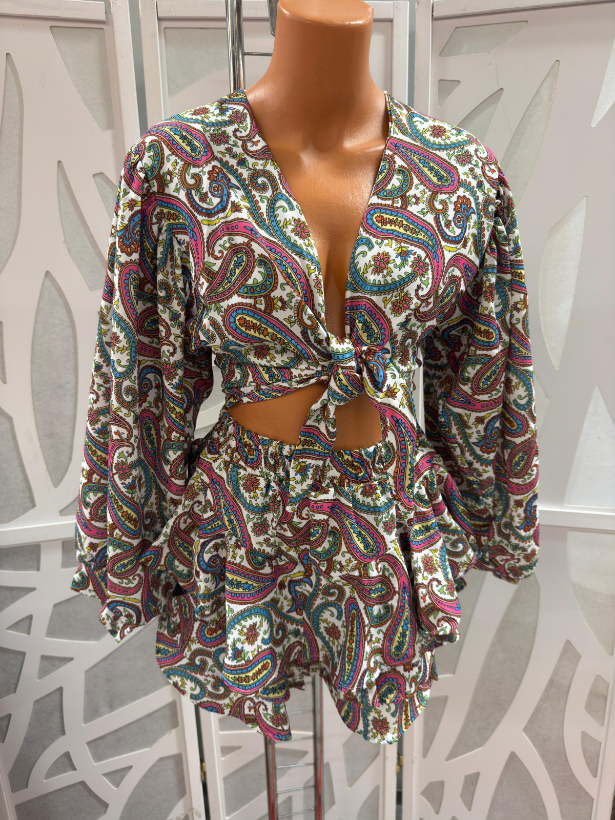 Set dama cu top cropped si fusta-pantalon, cu maneci bufante si imprimeuri trendy, ideal pentru vara. Marime universala (S-M).
