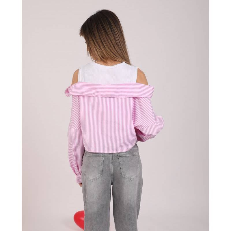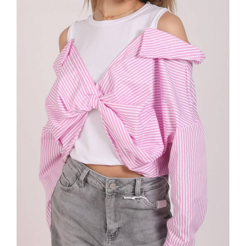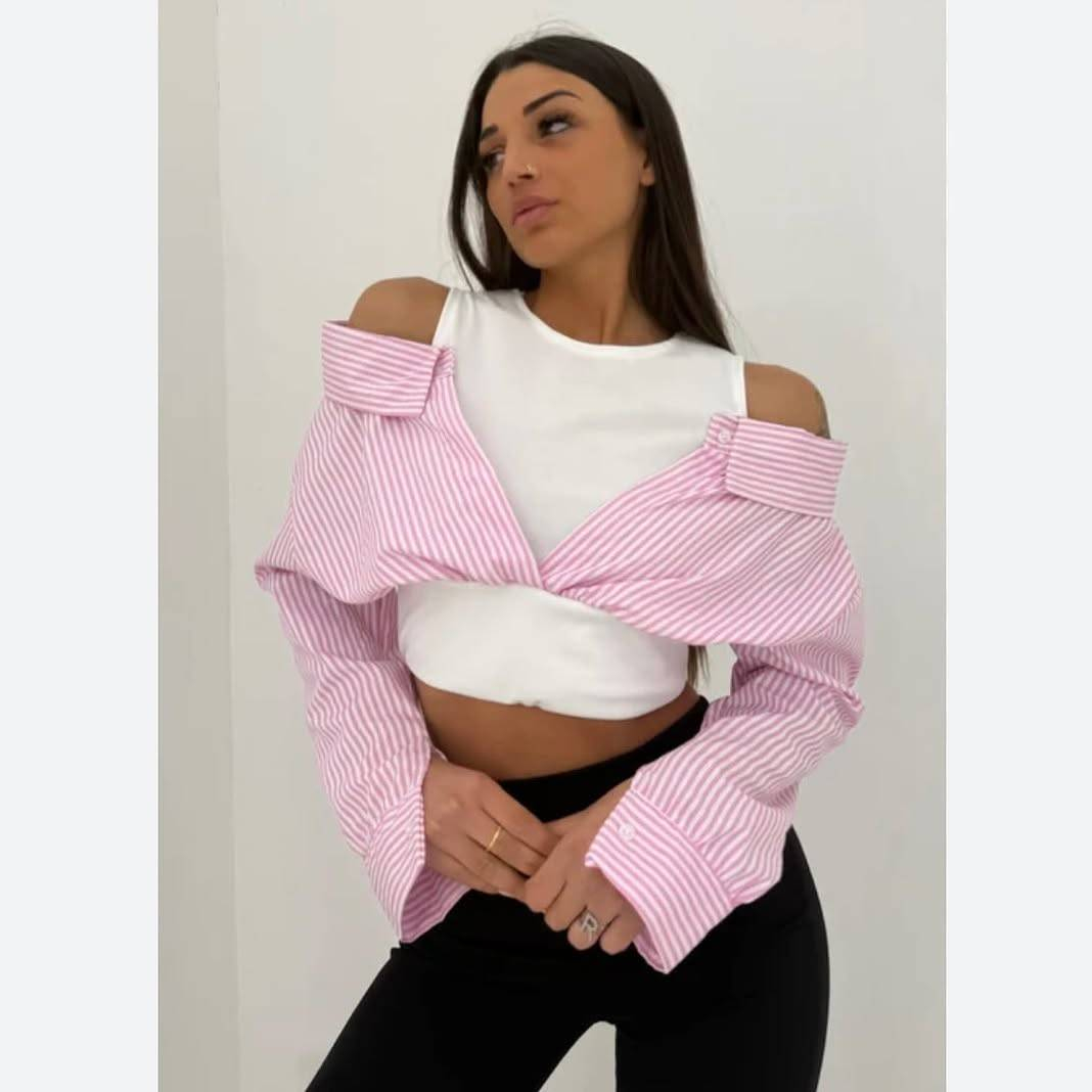 ✔️ Design 2 in 1 – maiou alb simplu cusut impreuna cu o camasa cu dungi in contrast, pentru un efect de stratificare fara efort.