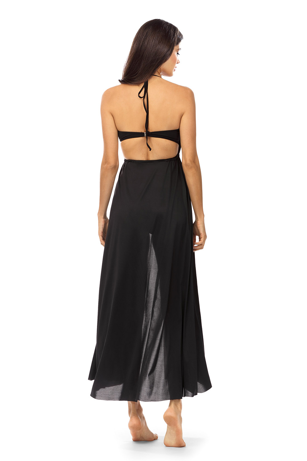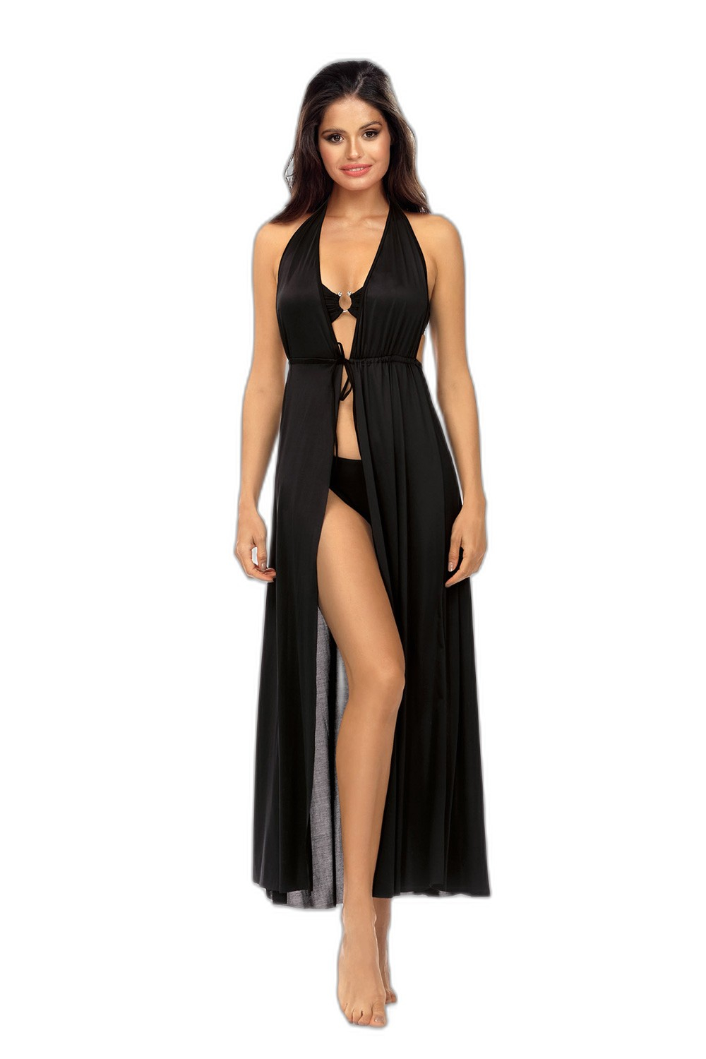Haina de plaja cu o croiala confortabila si lejera, cu spatele la vedere. Cu cordon sub bust, cravata la gat.