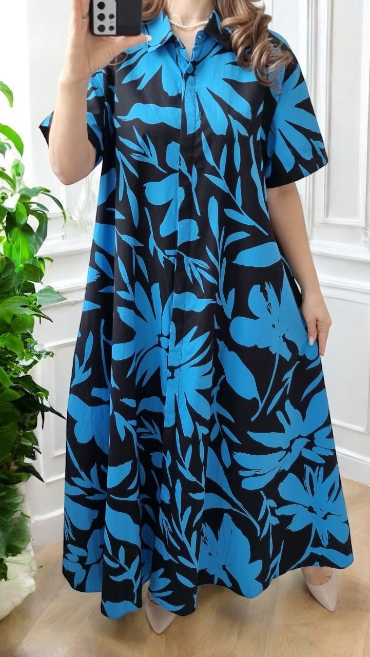 Rochie camasa lejera de vara, confectionata din bumbac moale si racoros, ideala pentru zilele calde. Cu un croi generos, lejer si fluid, aceasta rochie ofera libertate de miscare si un look casual chic. Inchidere frontala cu nasturi, maneca scurta si guler clasic. Se potriveste perfect pentru marimi S, M, L, XL si chiar XXL, avand circumferinta bustului de pana la 125 cm.