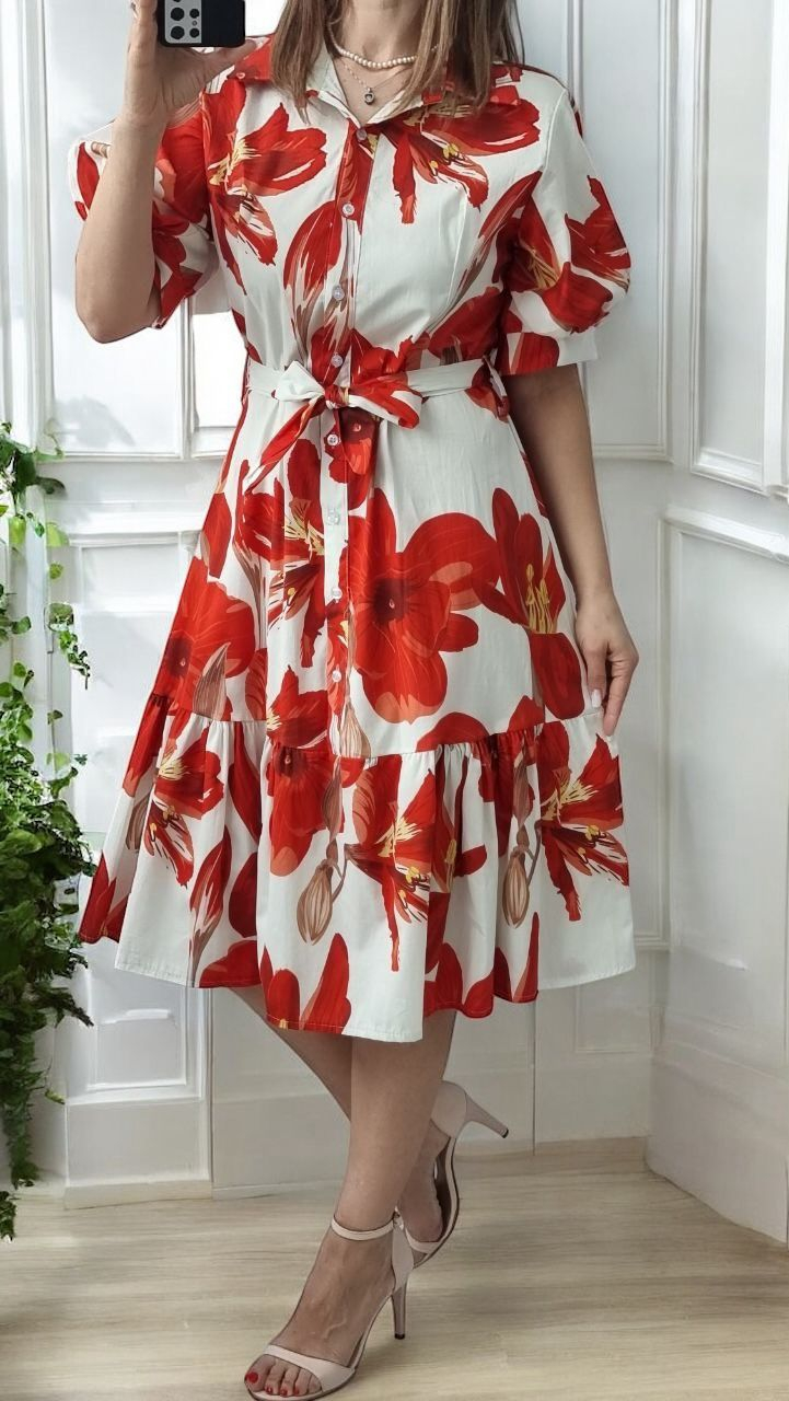 Rochia camasa midi Sarmina aduce un strop de prospetime si feminitate garderobei tale. Cu o croiala tip A-line si talie inalta, accentueaza elegant silueta si ofera libertate de miscare. Maneca scurta bufanta si gulerul tip camasa adauga un aer sofisticat, in timp ce imprimeul floral viu colorat transforma tinuta intr-o aparitie memorabila. Fabricata dintr-un material usor elastic (95% poliester, 5% elastan), aceasta rochie este ideala pentru iesiri casual, birou sau evenimente de zi.