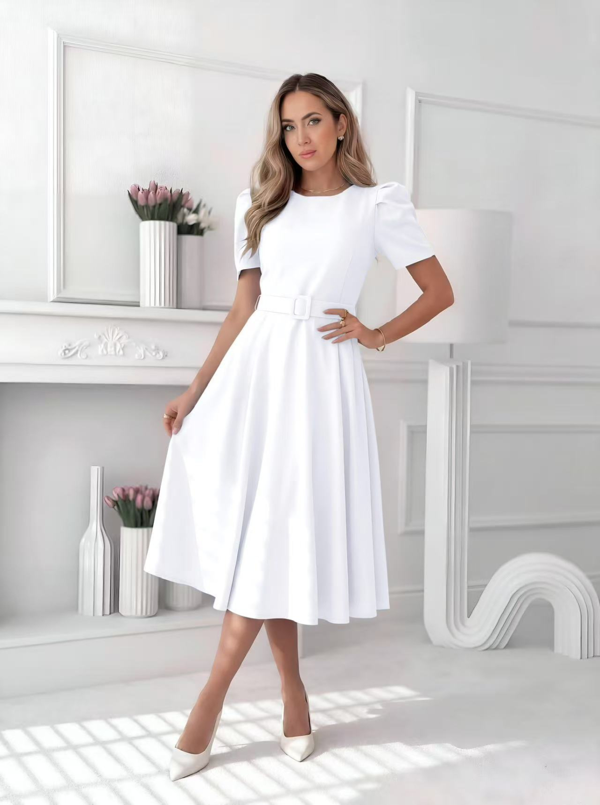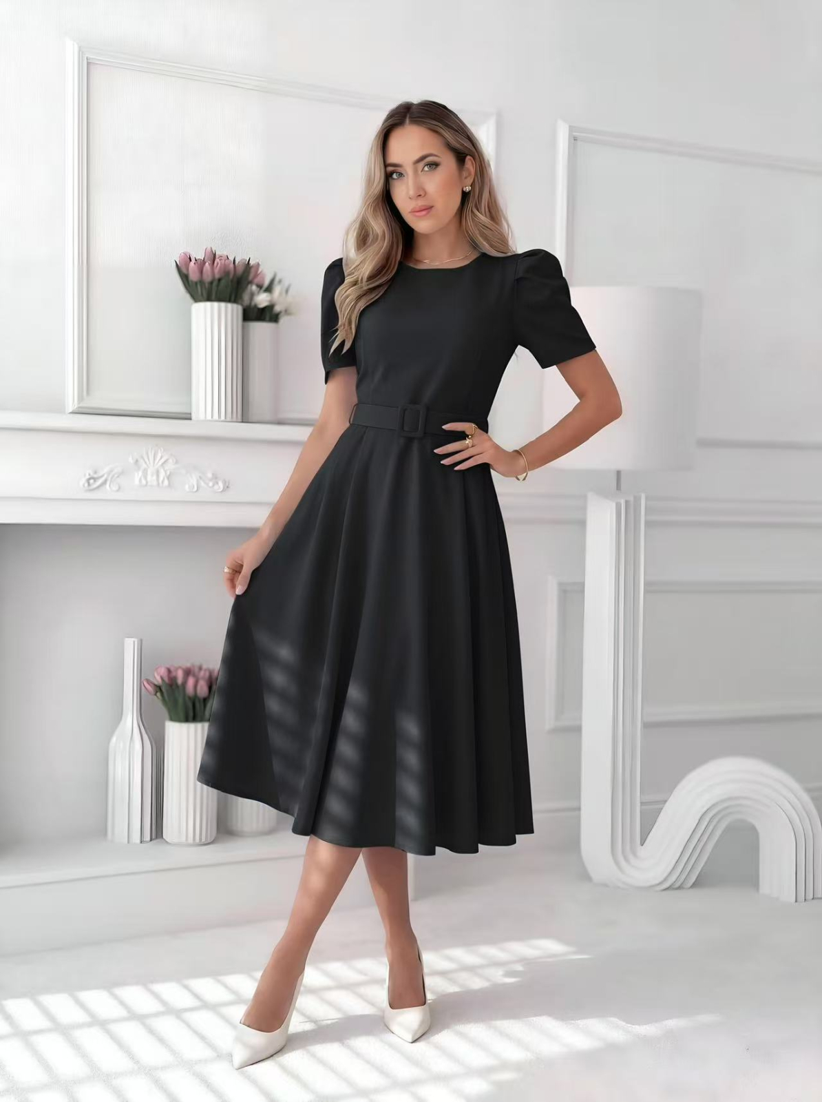 Rochia midi eleganta dama uni este alegerea potrivita pentru femeile care isi doresc un look feminin, rafinat si usor de adaptat in mai multe contexte. Modelul are o croiala ampla, talie evidentiata prin curea asortata si maneca scurta usor bufanta, detalii care contureaza o silueta armonioasa si eleganta. Designul simplu si curat pune in valoare linia rochiei si o transforma intr-o piesa versatila pentru garderoba de sezon.